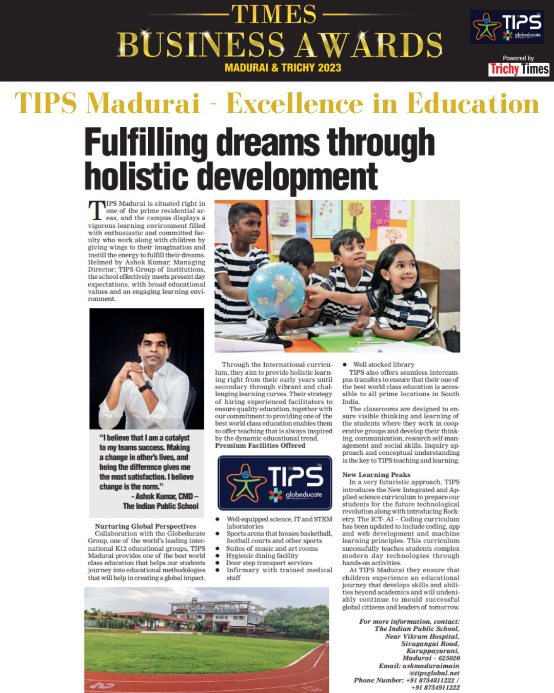 We are proud to announce that TIPS Madurai was presented with the Excellence in Education Award by the Times Group. We take this opportunity to thank all our parents and staff who believed in us and gave us continuous support.