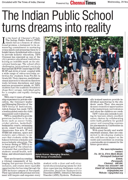 In a groundbreaking feature published in The Times newspaper today, TIPS Chennai takes center stage as an educational trailblazer, showcasing a host of innovative practices that are reshaping the landscape of modern schooling.